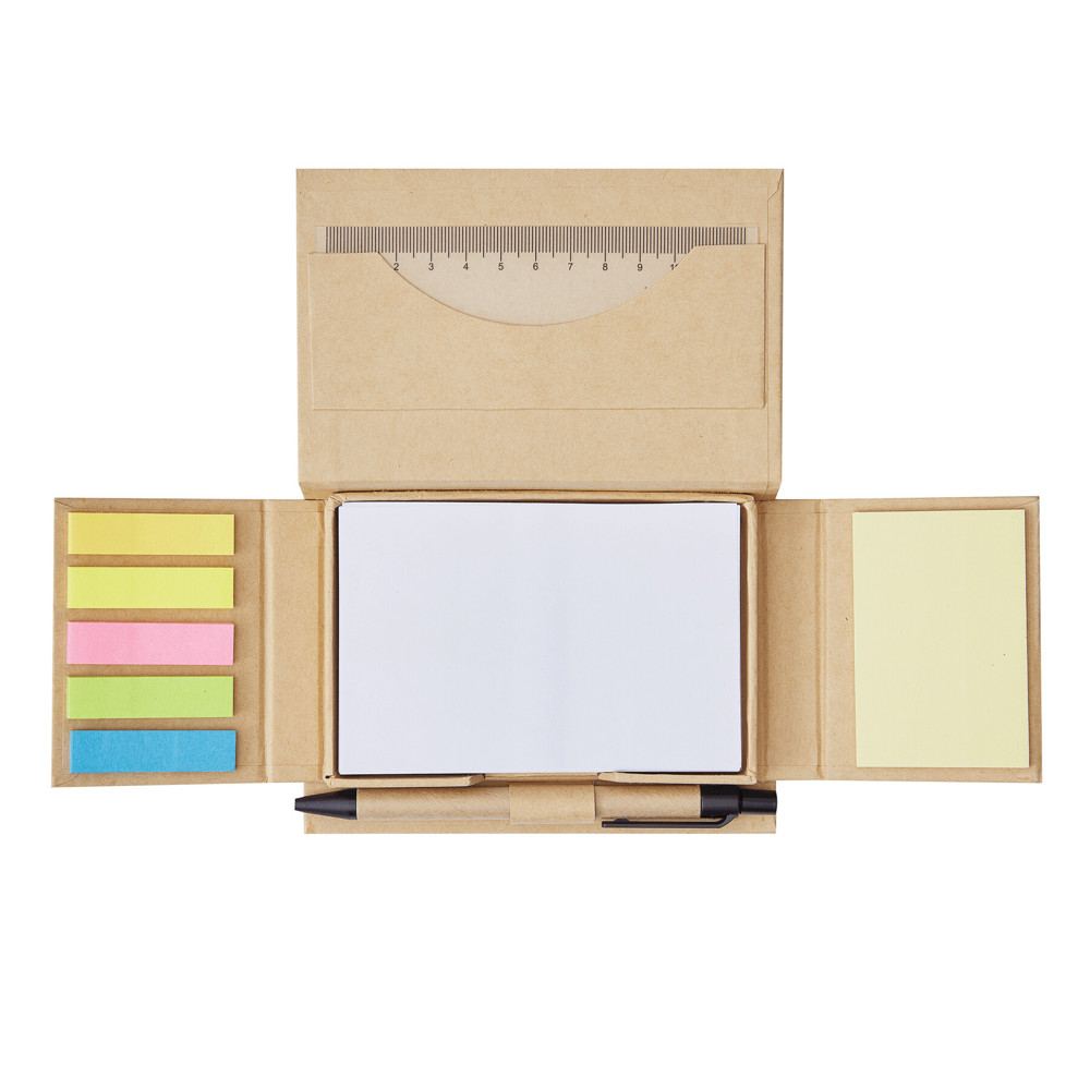 Memobox POP UP, zum Aufklappen: inkl. Kugelschreiber (schwarzschreibend) aus Kunststoff/Pappe, 1 Lineal (12 cm), 100 weißen Notizzetteln, 1 Klebenotizzettelblock, 5 verschiedenfarbige Klebenotizstreifen, mit Schlaufe für Kugelschreiber