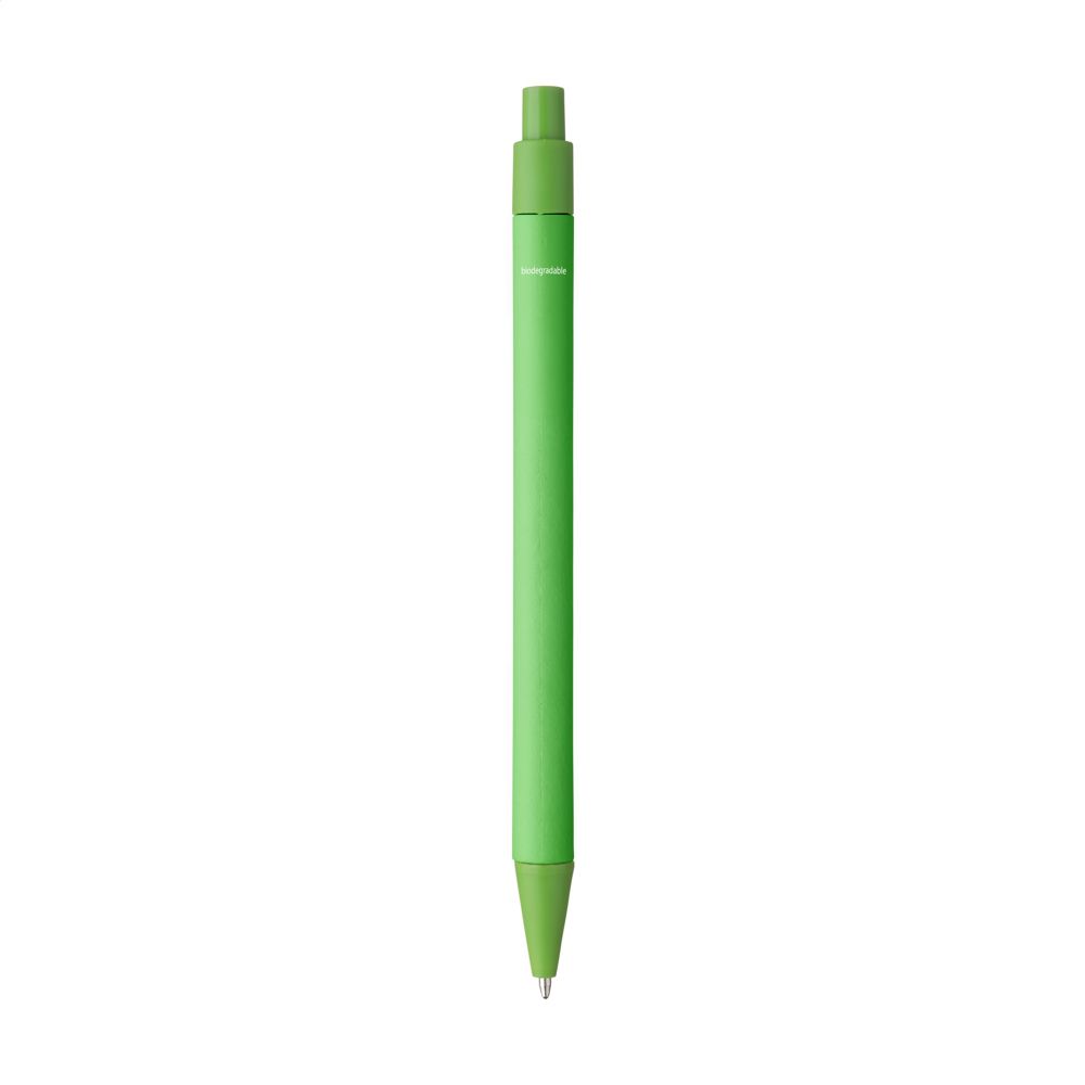 Blauwchreibender Kugelschreiber mit Halter aus Recyclingpapier. Der Clip, der Druckknopf und die Spitze bestehen aus biologisch abbaubarem PLA.