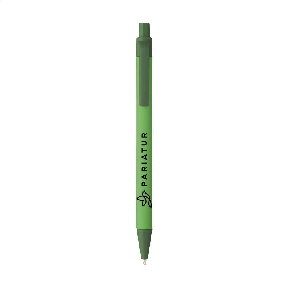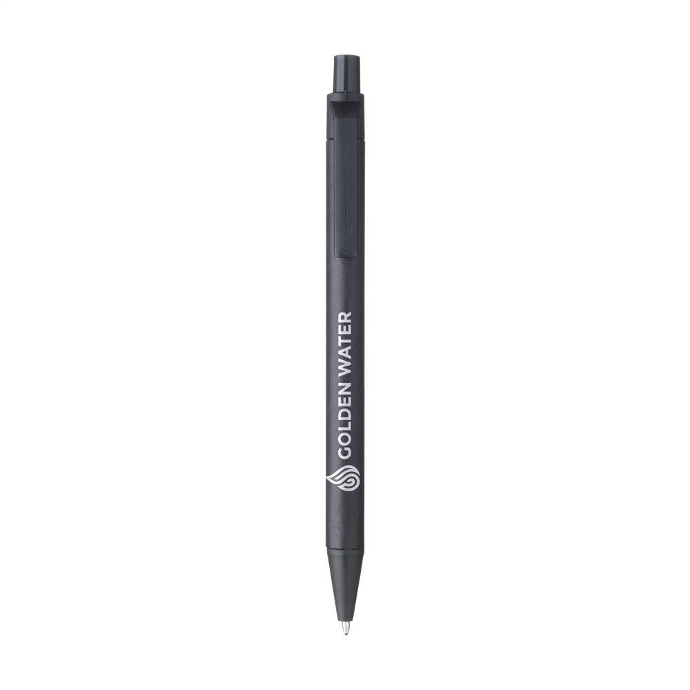 Blauwchreibender Kugelschreiber mit Halter aus Recyclingpapier. Der Clip, der Druckknopf und die Spitze bestehen aus biologisch abbaubarem PLA.