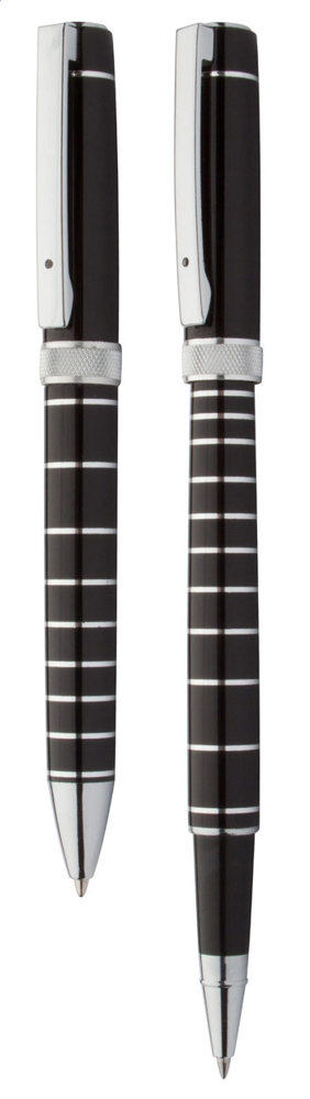 Elegantes Metall-Schreibset mit verchromten Ringen, bestehend aus Kugelschreiber, blauschreibend, und Rollerball. Einzeln in schwarzer Geschenkbox. André Philippe Markenprodukt.