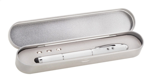 Multifunktions-Laserpointer mit Kugelschreiber, Touchpen und LED-Taschenlampe (inkl. Knopfzellenbatterien), blauschreibend. Einzeln in Metall-Geschenkbox.