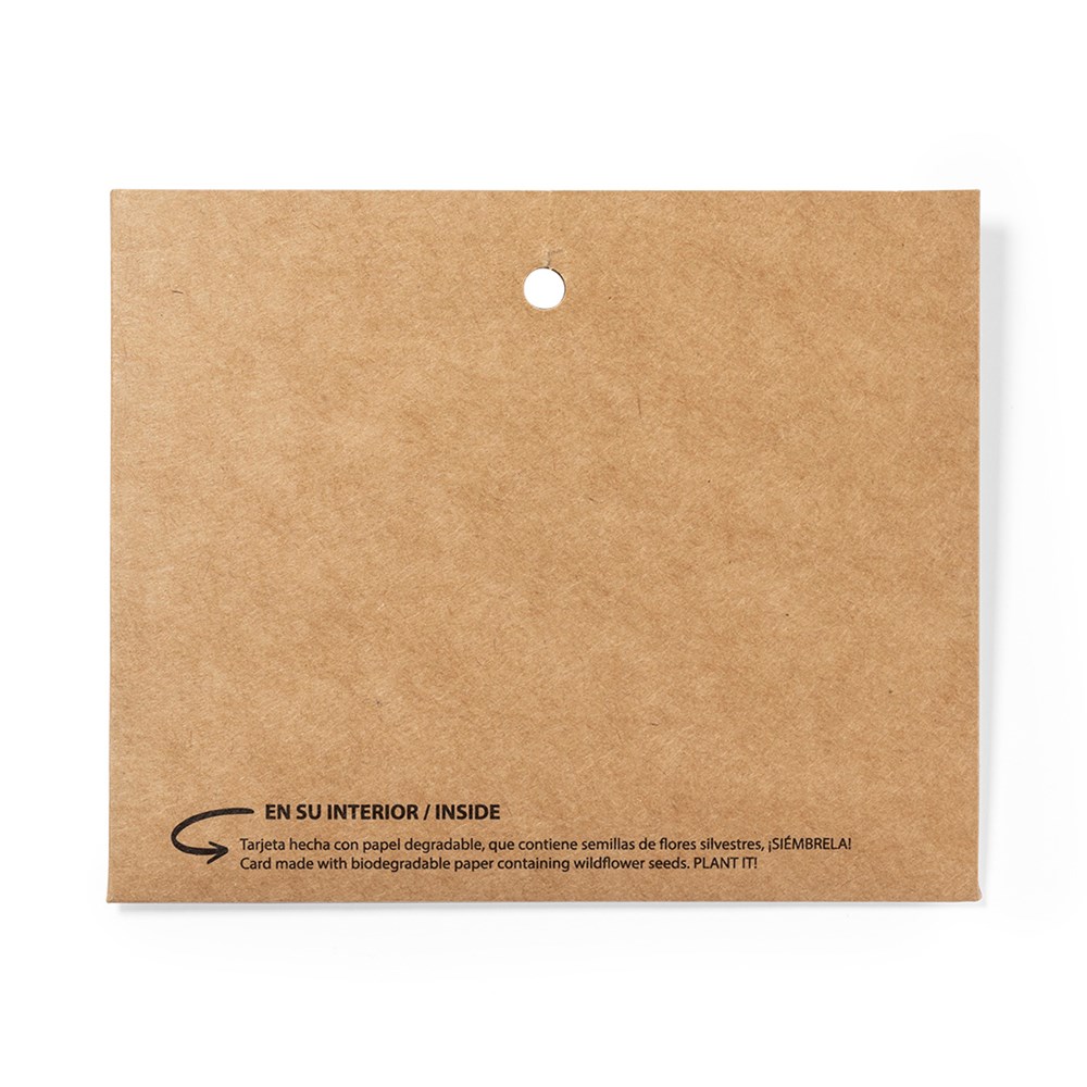Recyceltes Kraftpapier Namensschild. Inklusive einer Karte mit Wildblumensamen, die am Ende ihrer Lebensdauer in Pflanzpapier umgewandelt wird. Wildblumen in verschiedenen Farben, mit Pflanzanleitung im Inneren und Made in Europe-Emblem.