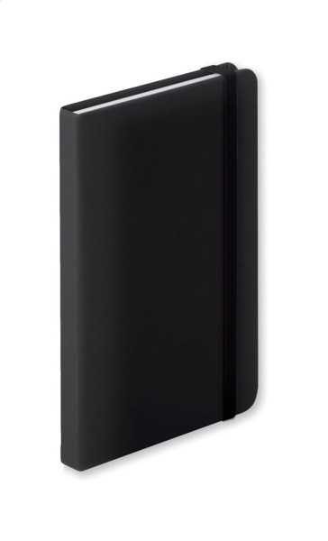 Notizbuch mit Kunstleder-Einband, 100 Seiten (liniert) mit Lesezeichen und Gummiband. A6-Größe.