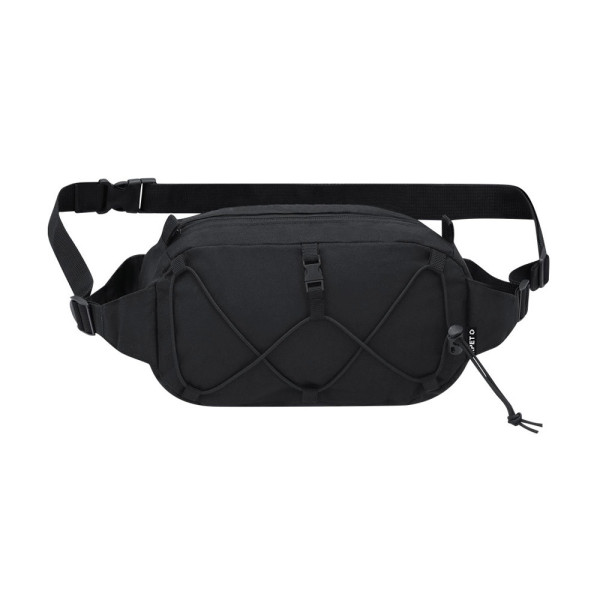 Bauchtasche aus 600D RPET-Polyester. Es hat eine Haupttasche mit einem unsichtbaren schwarzen Reißverschluss, einen schwarzen Metallzug und einen verstellbaren Gurt mit Schnallenverschluss am Riemen. An der Vorderseite befindet sich ein verstellbares Gummiband. Beinhaltet ein unverwechselbares RPET-Label.