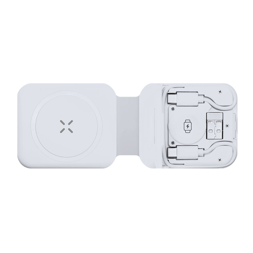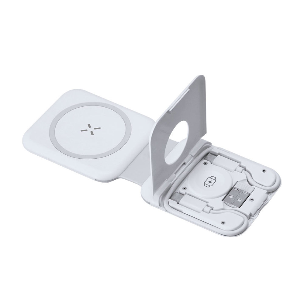 Komplettes 15W kabelloses Multicharger mit 3-in-1 faltbarem Gerätestand. Entwickelt für das gleichzeitige Laden von Smartphone/Kopfhörern und Smartwatch: eine All-in-One-Ladestation. Enthält einen Satz von Typ-C-Kabeln und einem USB-Adapter, geeignet für Datenübertragung.