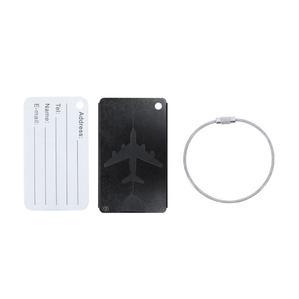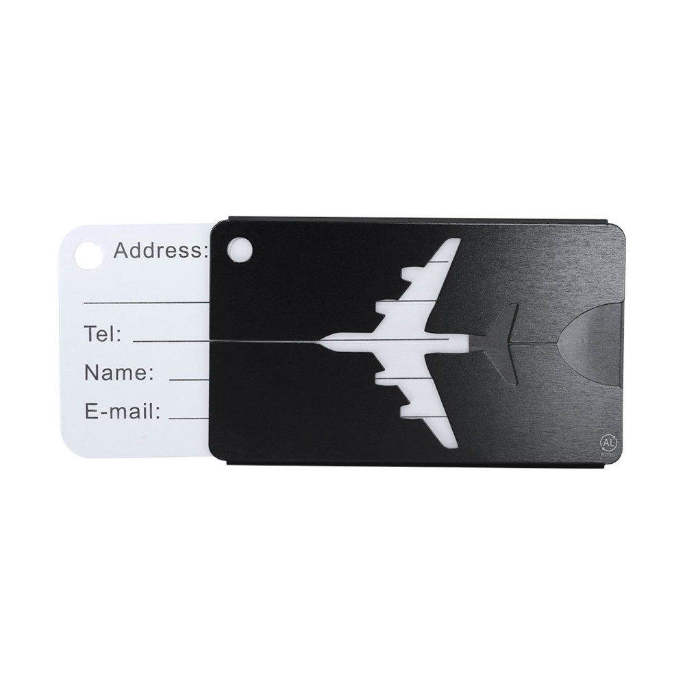Ursprüngliche Kofferkennung mit Flugzeugdesign aus widerstandsfähigem recyceltem Aluminium. Mit Edelstahl-Kupplungsband mit Schraubverschlusssystem und Ausweiskarte auf Englisch mit folgenden gedruckten Feldern; Addres, Tel, Name, E-mail. AL: Recyceltes Logo, lasergraviert.