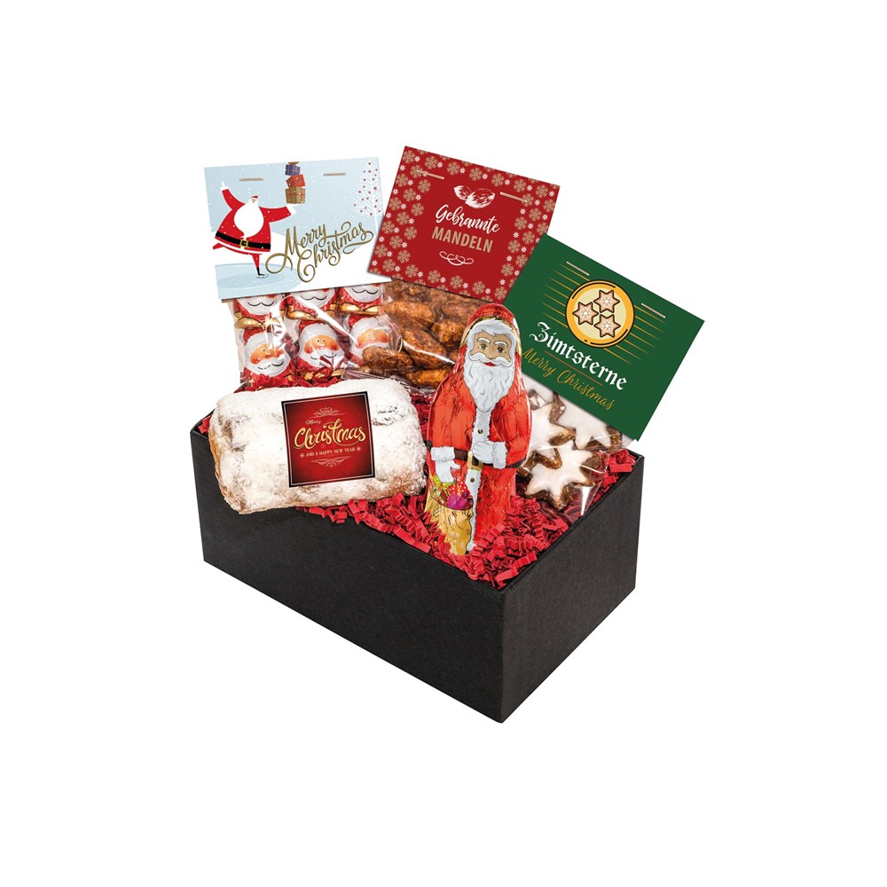 1 Gourmet-Christstollen 80 g, 1 Beutel feuergebrannte Mandeln 30 g, 1 Beutel Mini-Weihnachtsmänner 30 g, 1 Beutel Zimtsterne 30 g und 1 Schoko Weihnachtsmann 25 g, verpackt in einer hochwertigen Geschenk-Schatulle (2-teilig) • Optional kann die Geschenkverpackung mit einem Anhänger 4c an der Schleife, einer Banderole 4c um die Geschenk-Schatulle herum oder einem Druck 1c direkt auf den Deckel individualisiert werden. Zusätzlich können der Stollen mit einem Etikett 4c und die Tüten mit Mini-Weihnachtsmännern, gebrannten Mandeln und Zimtsternen mit einen Reiter 4c individualisiert werden.