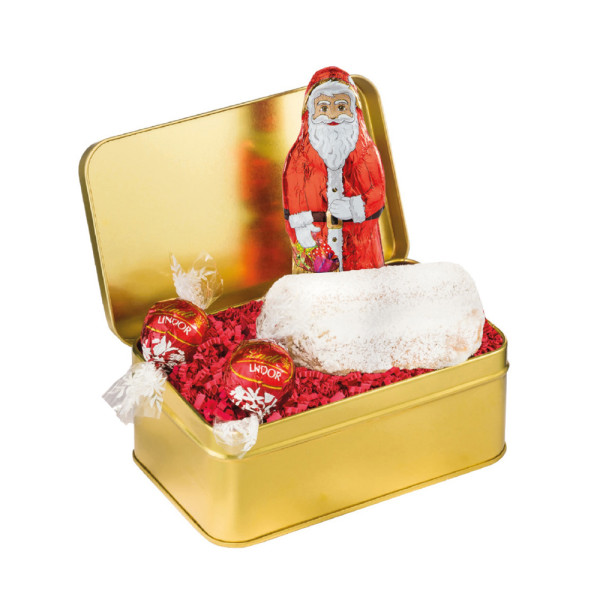 1 hochwertige, goldene Stülpdeckeldose mit rotem Schleifenband, gefüllt mit: 1 Gourmet-Christstollen 80 g, 2 Lindt Lindor-Kugeln Vollmilch je 12,5 g und 1 Schoko-Weihnachtsmann 25 g. • Der Gourmet-Stollen wird aus erlesenen Zutaten gebacken und kann auf der transparenten Verpackung mit einem 4c Etikett individualisiert werden. Die Goldbox kann mit einem 1c Druck und mit einem 4c Etikett auf dem Deckel oder mit einem 4c Anhänger am Schleifenband veredelt werden.
