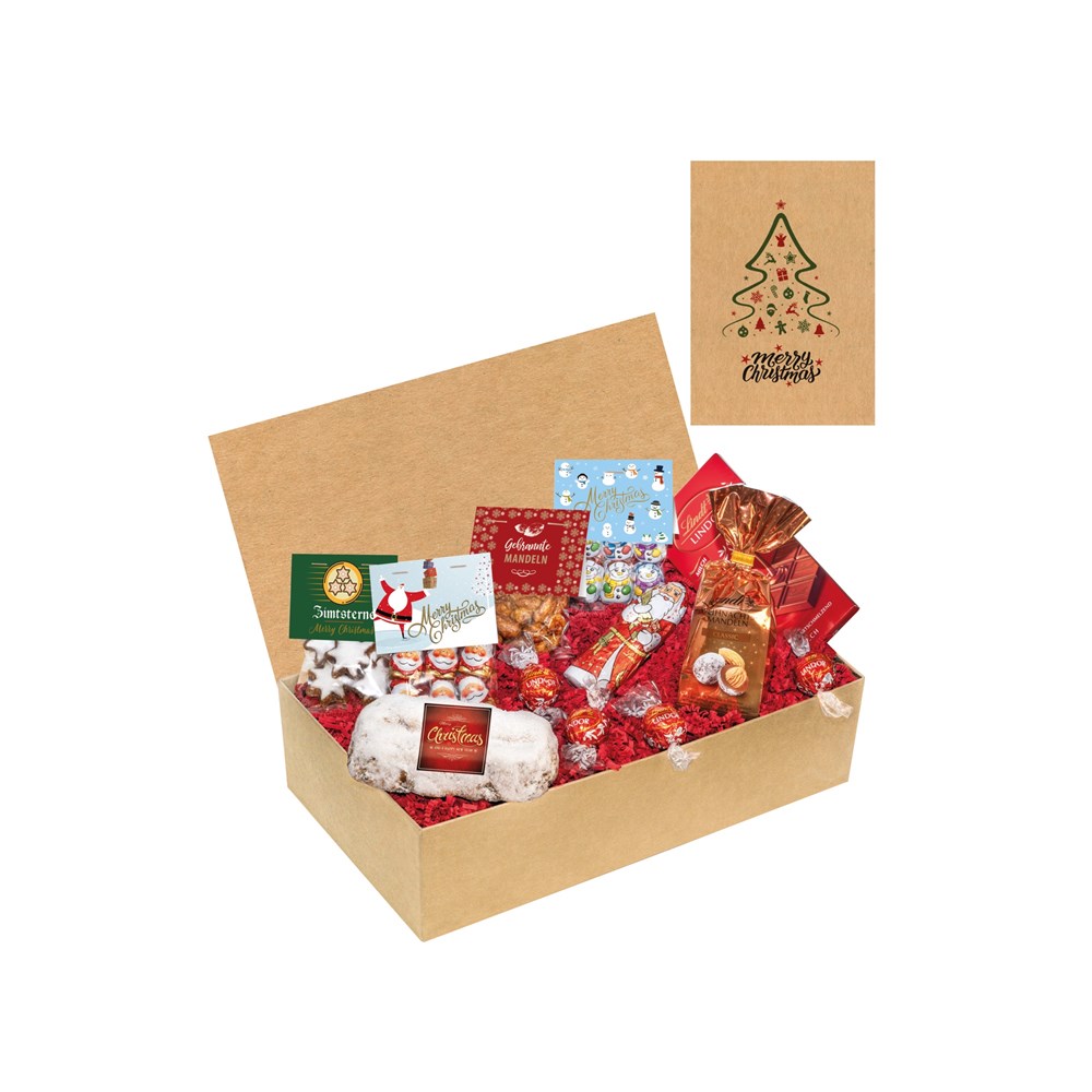 1 Gourmet-Christstollen 200 g, 1 Beutel feuergebrannte Mandeln 30 g, 1 Beutel Mini-Weihnachtsmänner 30 g, 1 Beutel Mini-Schneemänner 30 g, 1 Tafel Lindt Lindor-Schokolade 100 g, 4 Lindt Lindor Kugeln Vollmilch je 12,5 g, 1 Beutel Zimtsterne 30 g, 1 Beutel Lindt Weihnachtsmandeln 100 g (gerösteten Mandeln in Gianduja Milchschokolade und Vollmilchschokolade), 1 Lindt Weihnachtsmann 40 g, verpackt im Geschenkkarton Natur mit Standard-Druck "Merry Christmas" und Einzel-Postversandkarton. Ab einer Menge von 200 Stück ist ein individueller 4c Druck auf der Box bereits im Preis enthalten (zuzüglich Vorkosten). • Die Geschenkbox Natur ist eine vorbildliche und nachhaltige Geschenkverpackung aus 70% recyceltem Material und 30% Material aus kontrollierter Waldwirtschaft. Der Geschenkkarton kann auf Wunsch mit einem 4c Druck oder 1c Druck auf dem Deckel individualisiert werden. Desweiteren können der Stollen mit einem Etikett 4c und die Tüten mit Mini-Weihnachtsmännern, Mini-Schneemännern, gebrannten Mandeln und Zimtsternen mit einen Reiter 4c individualisiert werden. Das Präsent ist postversandfähig verpackt.