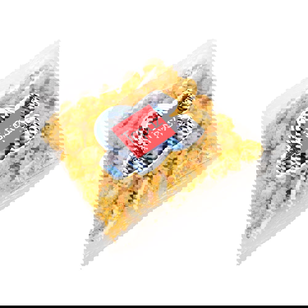 Quadratische, transparente Tüte mit 4c-Euroskala bedrucktem Aufkleber in eigener Form, ca. 30 g süßes Popcorn oder 18 g salziges Popcorn.