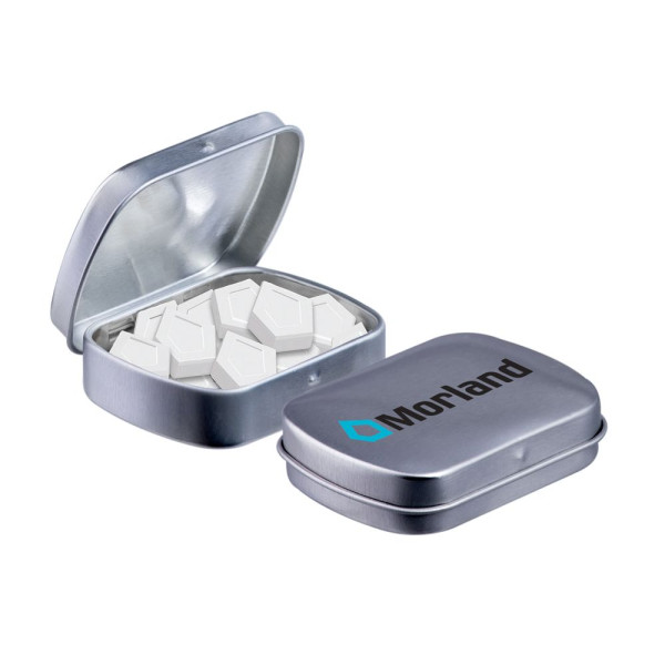 Mini Klappdeckeldose silber mit ca. 23 Gramm Logo Pfefferminz, 4c-Euroskala bedruckt, mit Zutatenaufkleber und eingeschweißt