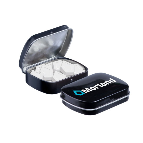 Mini Klappdeckeldose schwarz mit ca. 23 Gramm Logo Pfefferminz, 4c-Euroskala bedruckt, mit Zutatenaufkleber und eingeschweißt