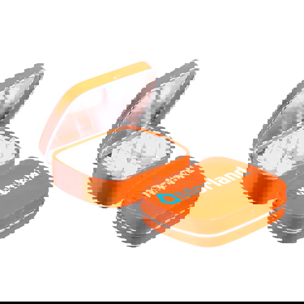 Mini Klappdeckeldose orange mit ca. 23 Gramm Logo Pfefferminz, 4c-Euroskala bedruckt, mit Zutatenaufkleber und eingeschweißt