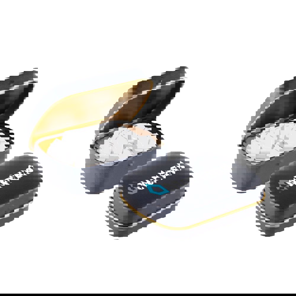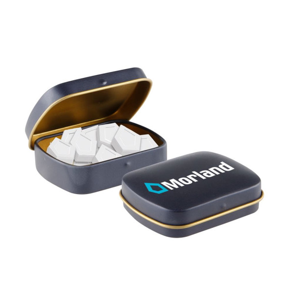 Mini Klappdeckeldose in Dunkelblau mit goldener Innenseite und ca. 23 Gramm Logo Pfefferminz. Mit Vollfarbdruck, Inhaltsstoffaufkleber und Siegel.
