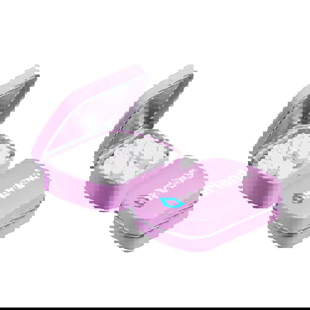 Mini Klappdeckeldose rosa mit ca. 23 Gramm Logo Pfefferminz, 4c-Euroskala bedruckt, mit Zutatenaufkleber und eingeschweißt