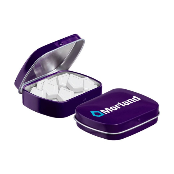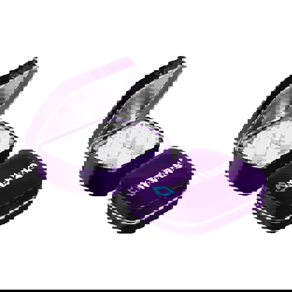 Mini Klappdeckeldose violett mit ca. 23 Gramm Logo Pfefferminz, 4c-Euroskala bedruckt, mit Zutatenaufkleber und eingeschweißt