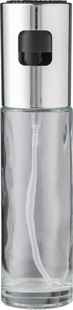 Ölspender aus Glas (100 ml). Mit Deckel aus chromatierter Kunststoff. Einzeln verpackt in einer braunen Papierbox.