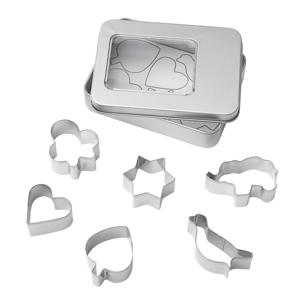 Ausstechförmchen-Set COOKIE BOX, 6-teilig: bestehend aus rostfreien Edelstahl-Ausstechern in verschiedenen Motiven - ideal zum Plätzchenbacken, in Edelstahlbox mit Sichtfenster