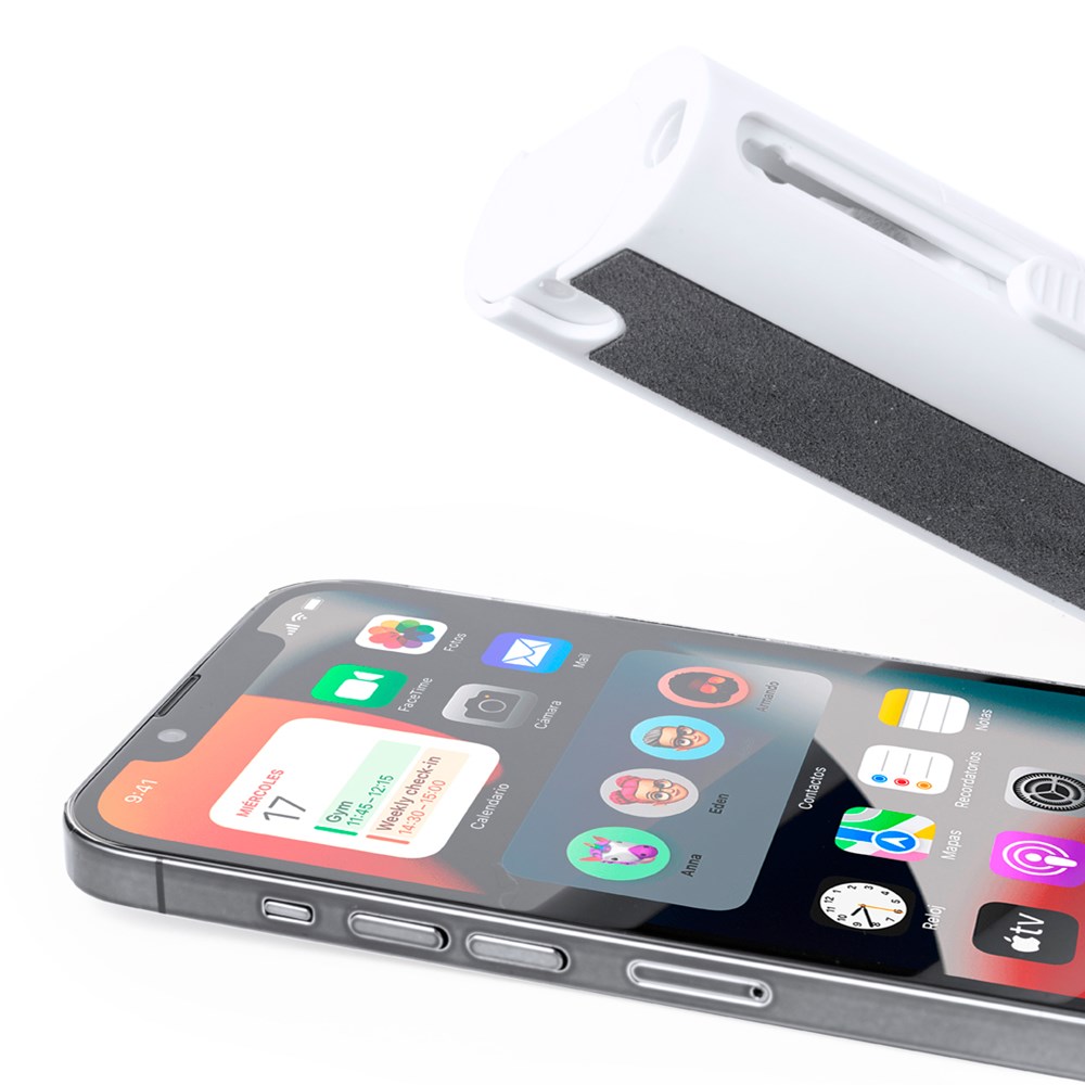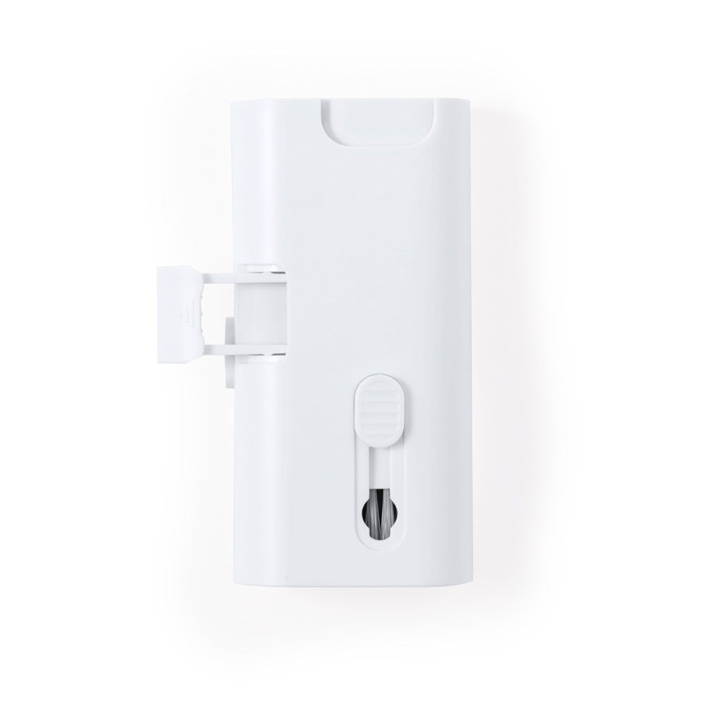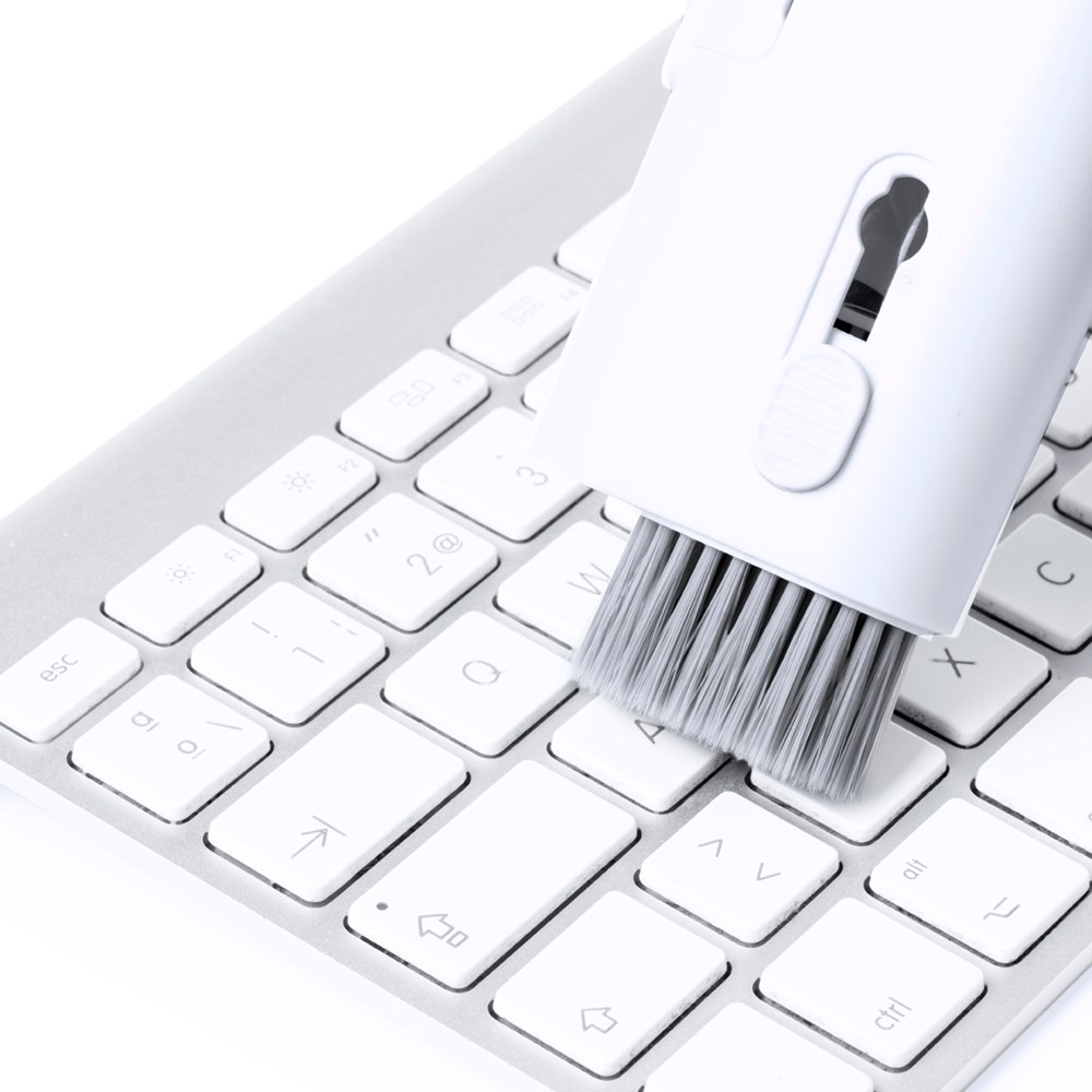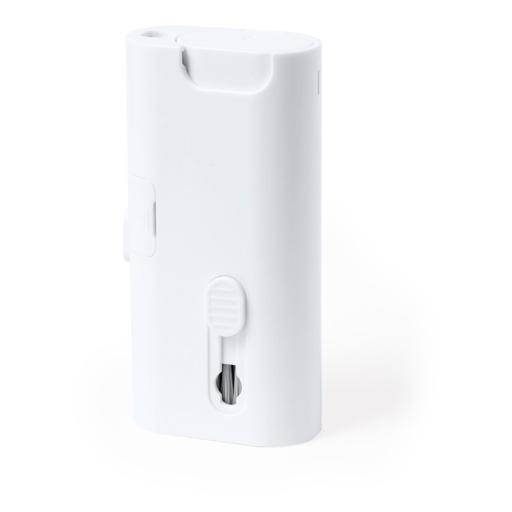 Komplettes Reinigungsset mit 6 Funktionen, speziell für die Pflege und Wartung von technischen Geräten entwickelt. Alle Zubehörteile befinden sich im Inneren des Koffers und sind durch Drücken der entsprechenden Taste einsatzbereit. Enthält einen nachfüllbaren Innentank mit Zerstäuber, einen Bildschirmreinigungsbereich, eine Metallspitze, einen Reinigungsstab, verschieden geformte Bürsten und ein Zubehör zum Entfernen des Schlüssels. Hergestellt aus widerstandsfähigem ABS, mit elegantem weißem Design und einzeln in einer Kraft-Design-Box präsentiert.