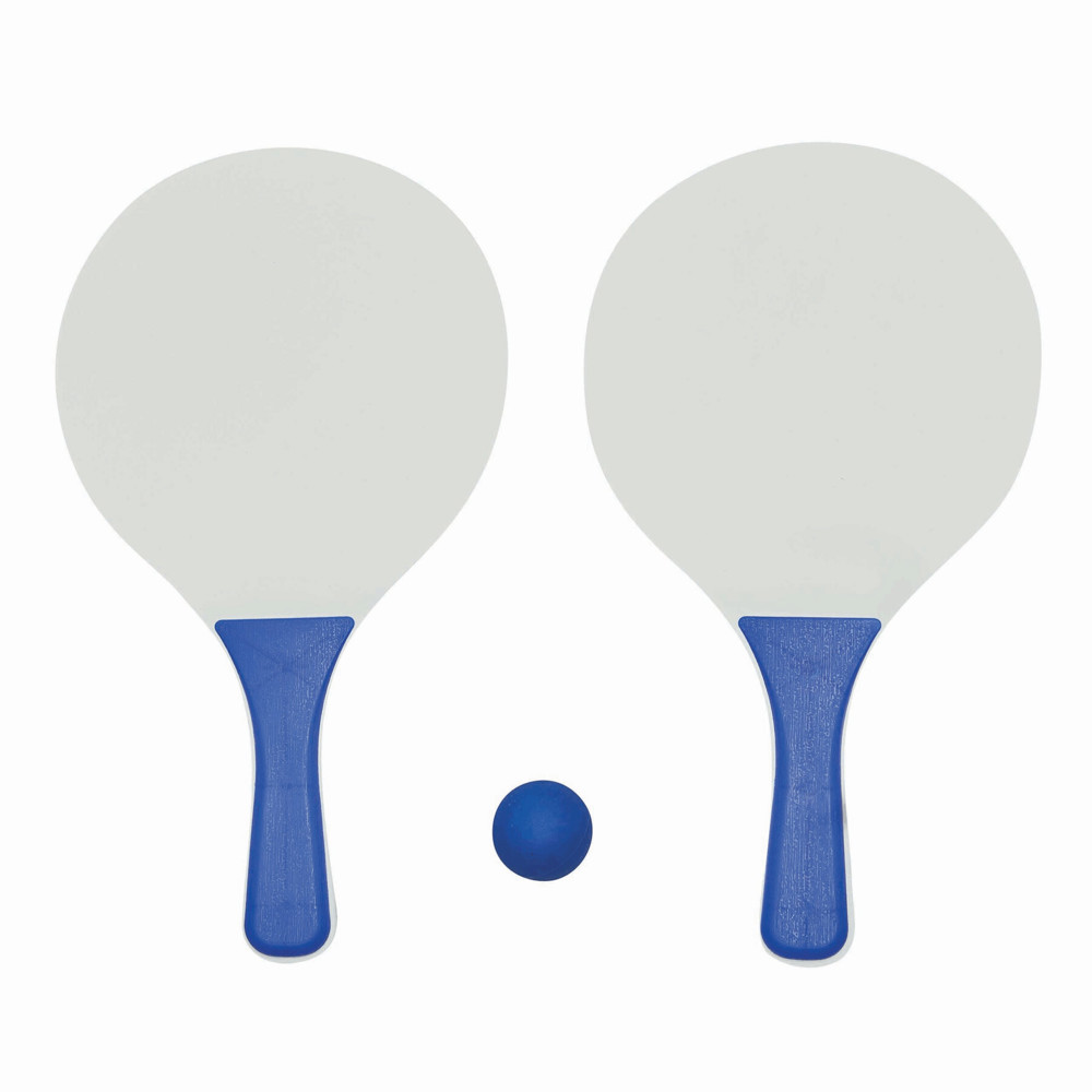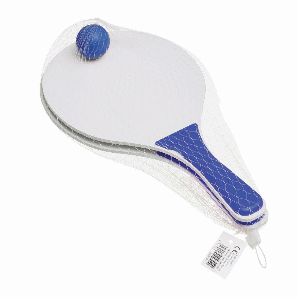 Beachball-Set SUMMER FEELING, 3-teilig: bestehend aus 2 Holzschlägern mit farbigen Griffen und 1 Softball, im Netzbeutel