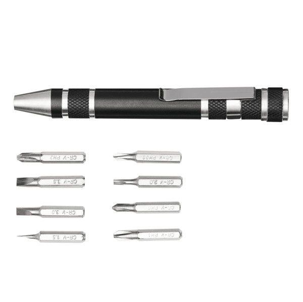Bit-Set MICRO, 9-teilig: bestehend aus 8 verschiedenen Bits (befinden sich am aufschraubbaren Stiftende) und Bit-Halter, Bits werden per Magnet an der Spitze gehalten, praktischer Befestigungsclip, in Box
