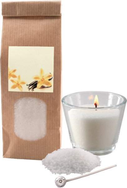 Der angenehme Duft von Vanille schafft eine behagliche Stimmung in der kalten Jahreszeit. Das Wachsgranulat einfach in ein hitzebeständiges Gefäß füllen, den mitgelieferten Docht mittig platzieren und anzünden. Eine Werbeanbringung auf dem Standardmotiv des Etiketts oder eine individuelle Gestaltung ist ab 250 Stück möglich. Inhalt: ca. 80 g Wachsgranulat mit Duft Bourbon Vanille, Docht