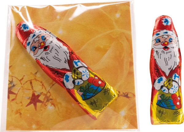 Über diese kleine Aufmerksamkeit freuen sich Ihre Kunden in der Weihnachtszeit. Der Weihnachtsmann aus Edelvollmilchschokolade ist ideal zum Überreichen. Die Karte kann im Standardmotiv mit Ihrem Logo versehen werden oder, ebenfalls ab 250 Stück, komplett personalisiert werden. Inhalt: Schoko-Weihnachtsmann (5,5 g)