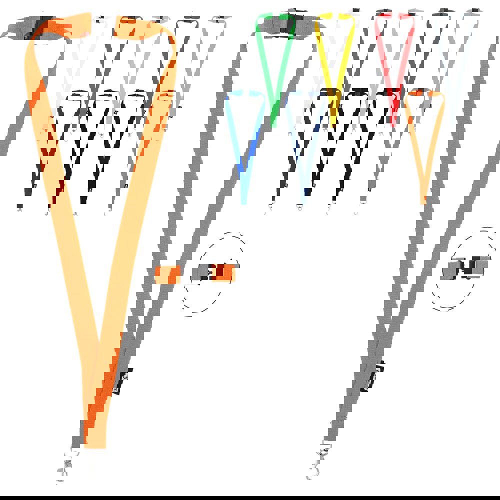 Mit unserem R-PET-Lanyard, das in einer Vielzahl von Farben erhältlich ist, haben Sie alles Wichtige immer bei sich. Das Schlüsselband ist mit einem Sicherheitsverschluss ausgestattet und eignet sich ideal zum Tragen von Schlüsseln, Ausweisen und vielem mehr.