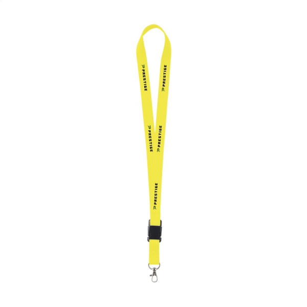 Schlüsselband aus stark gewebtem Polyester mit Karabinerhaken aus Metall. Der untere Teil lässt sich durch ein Klicksystem aus Kunststoff abtrennen.