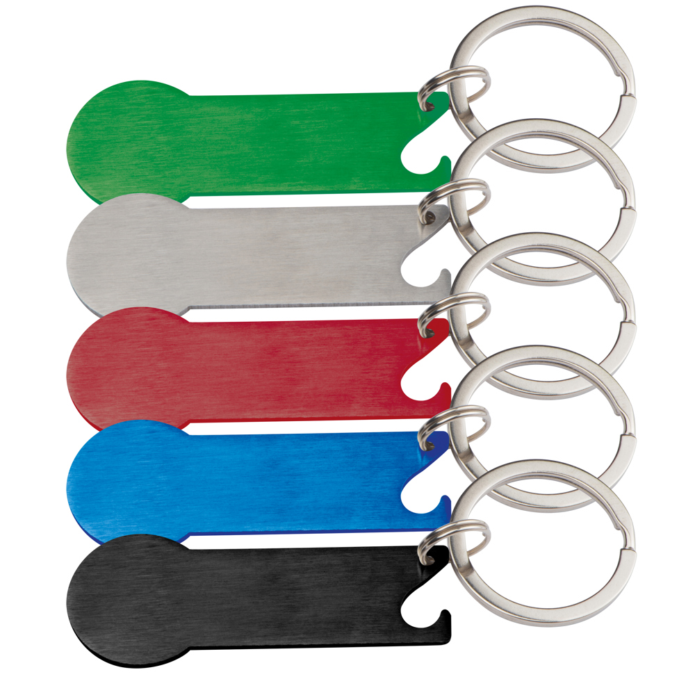 Schlüsselanhänger aus Edelstahl mit integriertem Einkaufswagenchip, Schlüsselring und Flaschenöffner. Ihre Werbung wird auf den Anhänger gelasert.