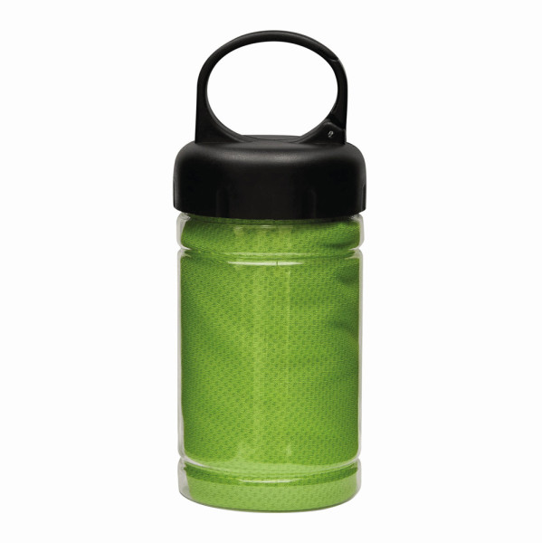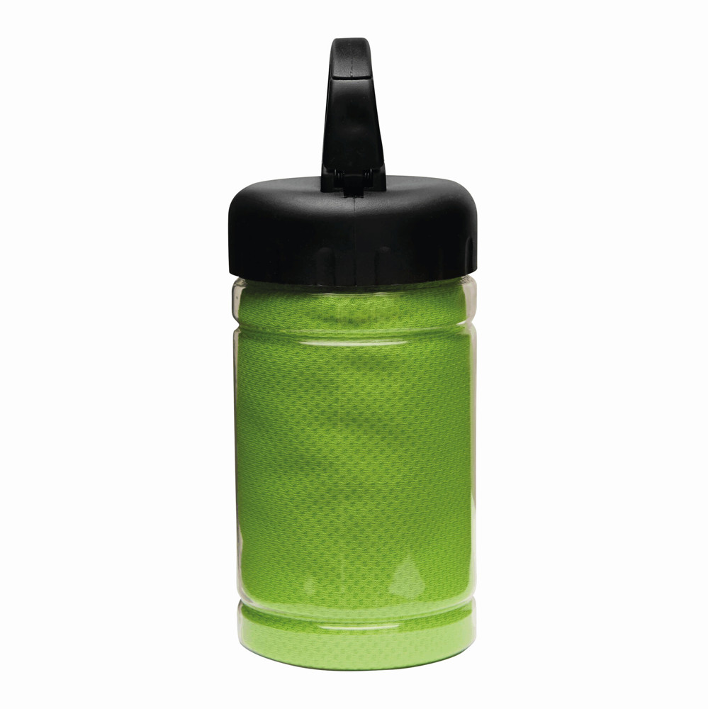 Kühlhandtuch CHILLING: in transparenter Dose, integrierter Sonnenschutzfaktor, für einen lang anhaltenden Kühleffekt Handtuch mit Wasser befeuchten und schleudern oder Wasser zur Dose hinzugeben und gut schütteln, Deckel mit Karabinerhaken (der Karabiner ist NICHT als Sicherung beim Klettern geeignet) - ideal für Fitness und Sportaktivitäten