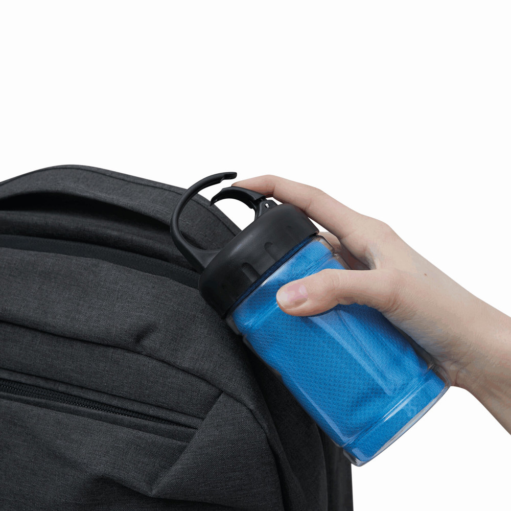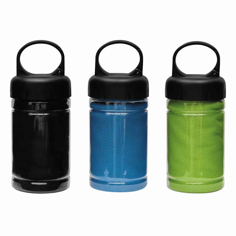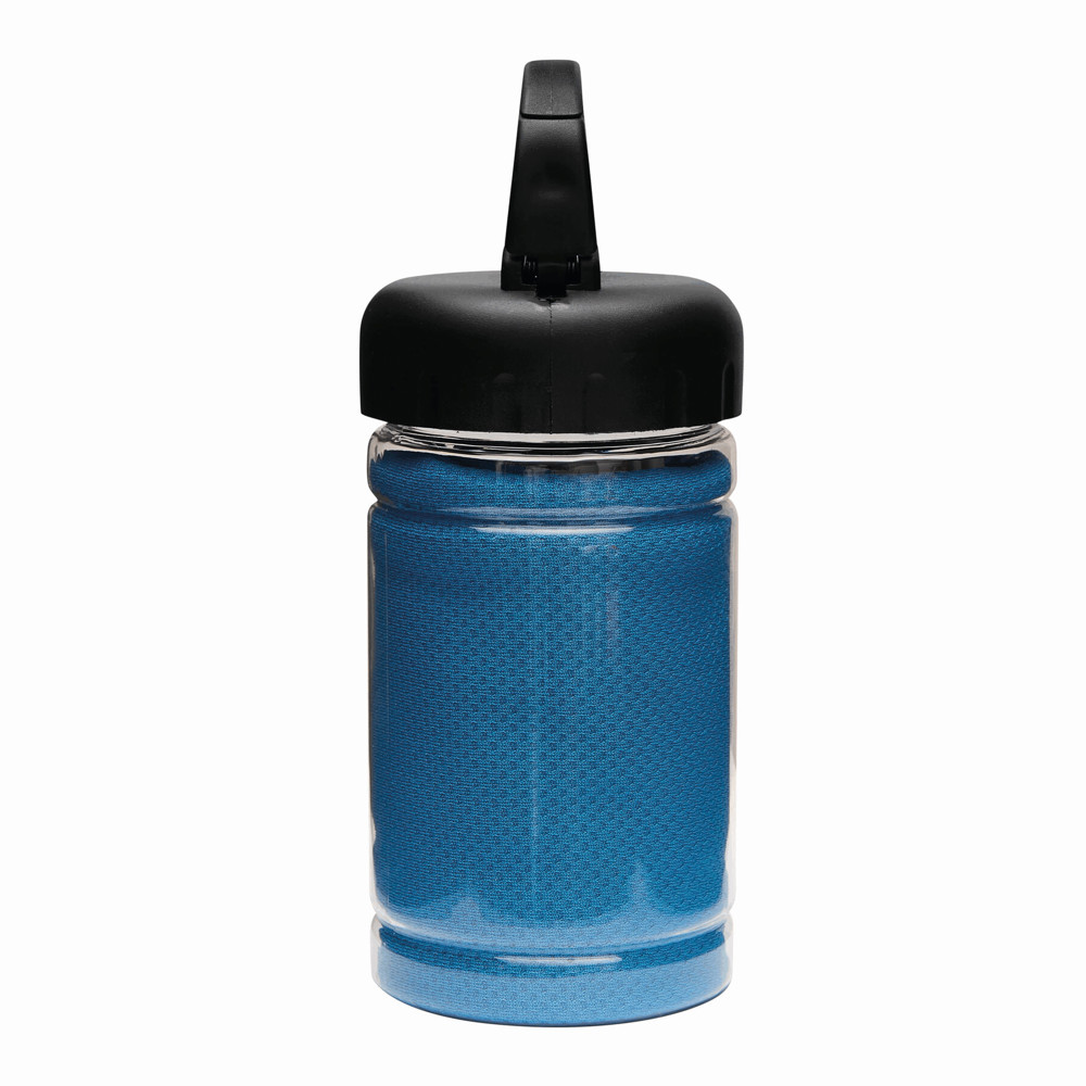 Kühlhandtuch CHILLING: in transparenter Dose, integrierter Sonnenschutzfaktor, für einen lang anhaltenden Kühleffekt Handtuch mit Wasser befeuchten und schleudern oder Wasser zur Dose hinzugeben und gut schütteln, Deckel mit Karabinerhaken (der Karabiner ist NICHT als Sicherung beim Klettern geeignet) - ideal für Fitness und Sportaktivitäten