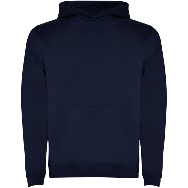 Zweifarbiger Kapuzenpullover mit doppeltem Stoff. Verstärkte und verdeckte Nähte am Kragen und an der Kängurutasche. Elastischer 1×1-Rippstrick an Ärmeln und Bund. Herausnehmbares Etikett. Das Modell ist 120 cm groß und trägt Größe 5/6.