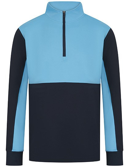 Kontrastierende Einsätze oben an der Brust und an den Ärmeln in Kontrastfarben | 1/4-Reißverschluss | Seitenblenden | Nylon-Reißverschlüsse auf der Rückseite an den mittleren Vorder- und Seitentaschen | 1x1-Ripp-Ärmelbündchen | Halbautomatischer Reißverschluss-Zipper