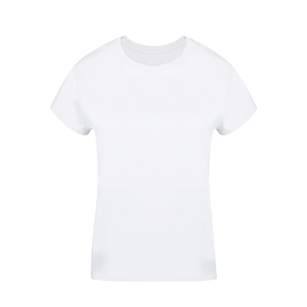 Damen-T-Shirt aus glattem Jersey, gefertigt aus weicher 100% Baumwolle, 160g/m². Tubuläres Design ohne Seitennähte und mit rundem Halsausschnitt. Erhältlich in Weiß und in den Größen S, M, L, XL, XXL.