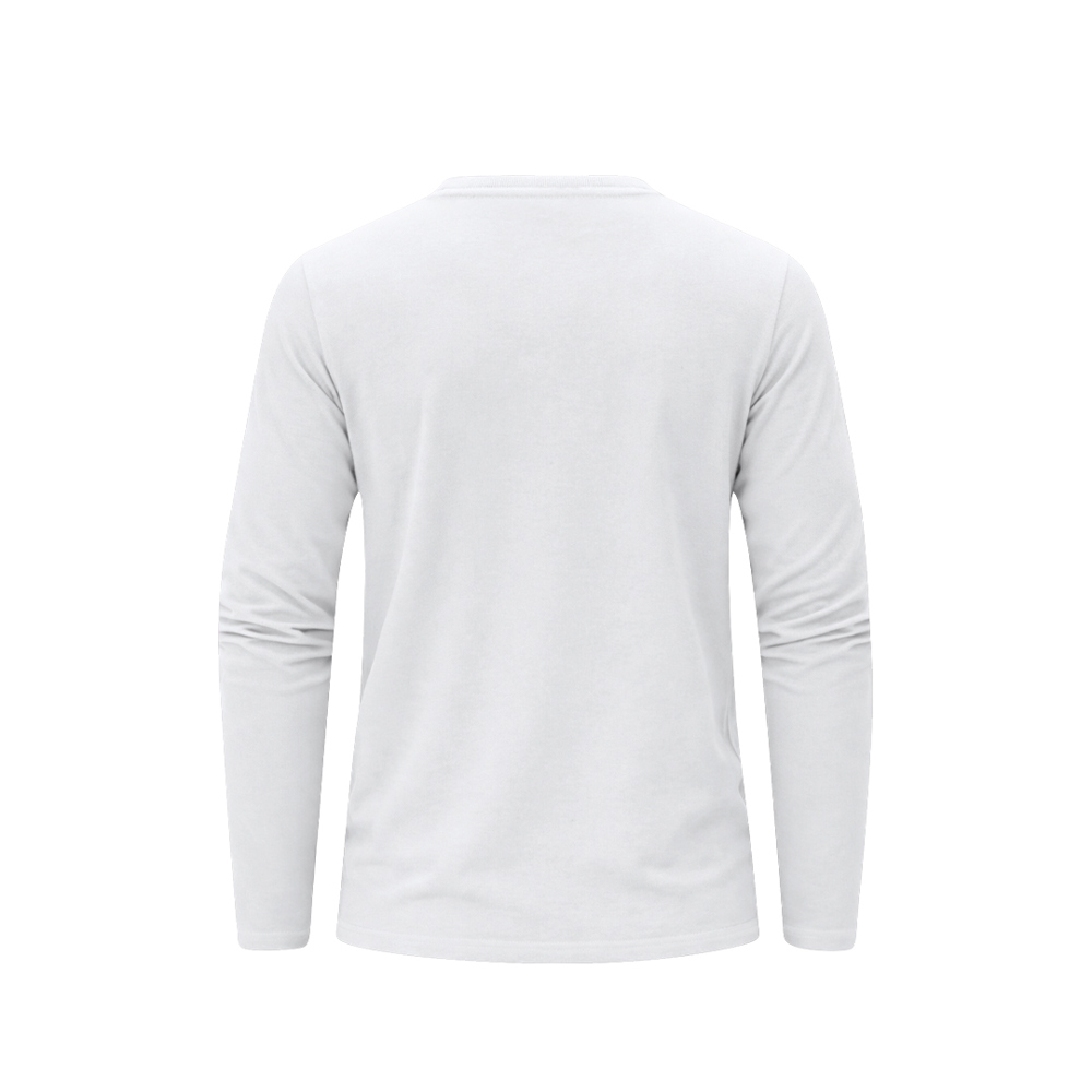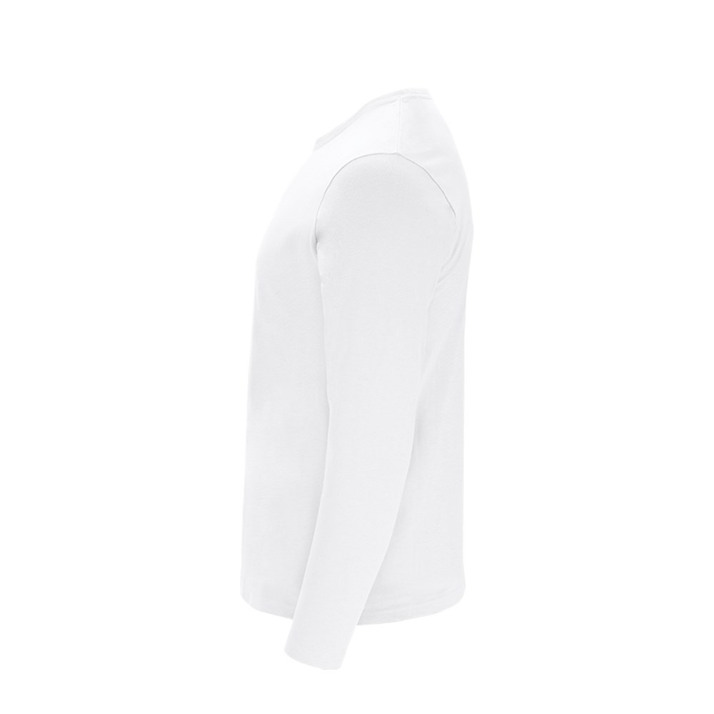 Erwachsenengröße, langärmeliges T-Shirt in Weiß, weich und angenehm im Griff aus 100% Baumwolle, 160 g/m² glatt gestrickt. Hergestellt aus Schlauchware, mit 1x1 geripptem Rundhalsausschnitt und passender, verstärkter Nahtabdeckung in Weiß.