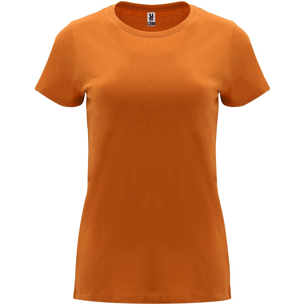 Tailliertes kurzärmeliges T-Shirt für Damen. Rundhalsausschnitt mit 1×1 Rippstrick. Verstärkte und verdeckte Nähte am Kragen. Herausnehmbares Etikett.