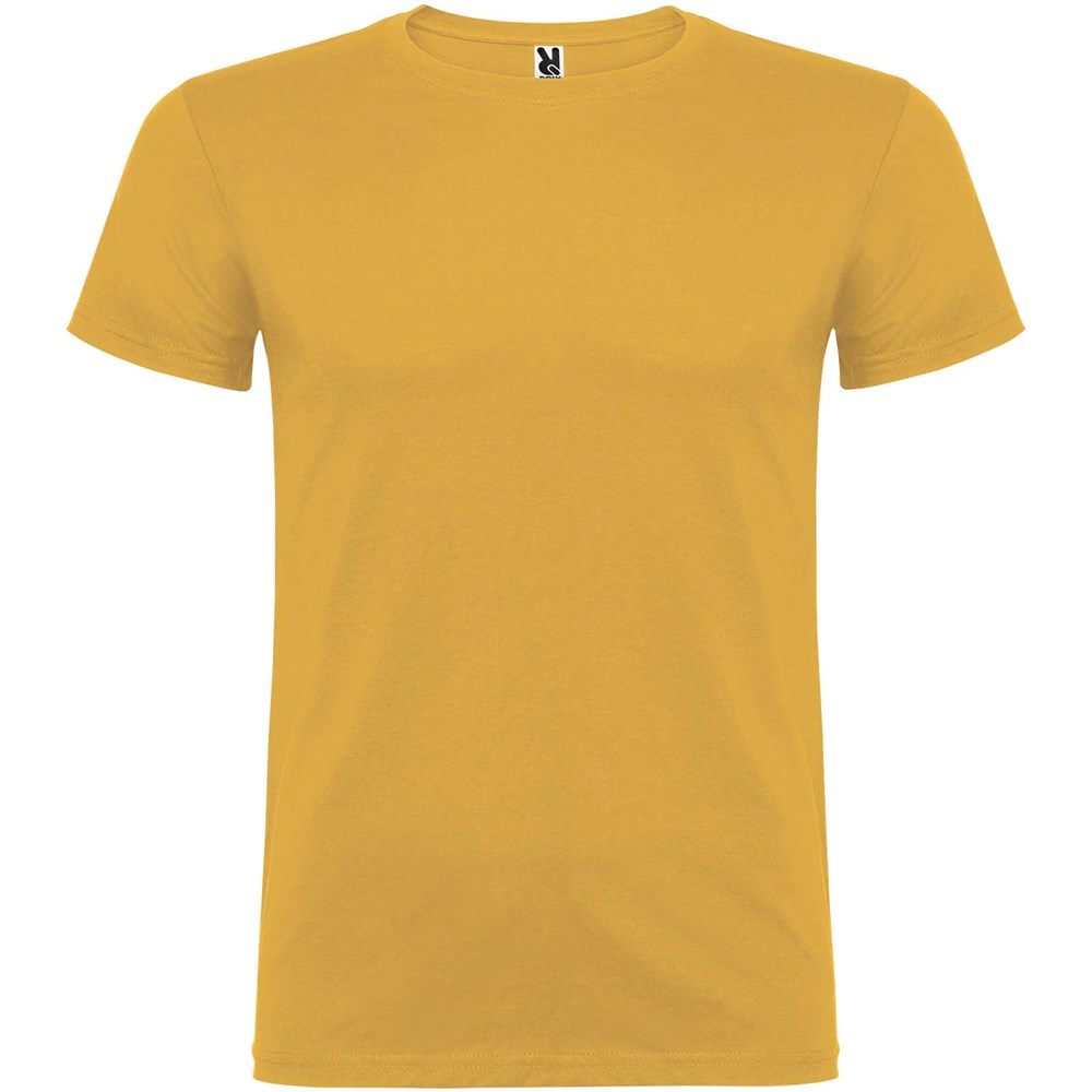 Kurzärmeliges T-Shirt mit doppellagigem Rundhalsausschnitt aus Elasthan, hergestellt aus schlauchförmigem Material für Erwachsene. Verstärkte und verdeckte Nähte am Kragen. Herausnehmbares Etikett. Das Modell ist 190 cm groß und trägt Größe L.