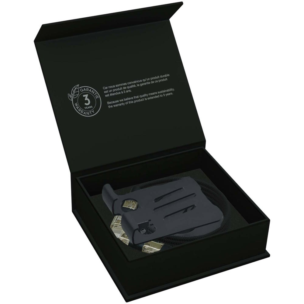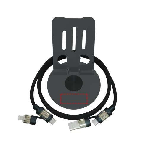 Faltbarer, 360° drehbarer Handyhalter. Geliefert mit einem 4-in-1 rPET-Kabel mit zwei Eingängen (USB-C/USB-A) und zwei Ausgängen (USB-C/Lightning). Dieses Produkt ist in erster Linie für die Verwendung mit Smartphones konzipiert, kann aber dank des mitgelieferten 240W-Kabels auch leistungsstarke elektronische Geräte wie Laptops, Spielkonsolen, Powerstations, Drohnen und mehr aufladen. Lasergraviertes Logo auf dem Ständer. Lieferung in einer Geschenkbox aus recyceltem Karton.