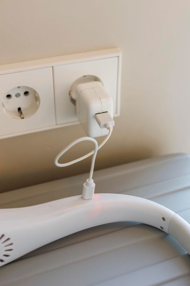 Nackenventilator mit 800-mAh-Akku und drei Geschwindigkeitsstufen. Hergestellt aus ABS, bietet hohe Schlagfestigkeit und lange Haltbarkeit für den täglichen Gebrauch. Wird um den Hals getragen, um den Nacken und das Gesicht mit Luft zu versorgen. Inklusive 30 cm langem USB-C-Ladekabel. Ladezeit 4–5 Stunden, Betriebszeit 2–3 Stunden. Einzeln verpackt in einem braunen Karton mit Illustration.