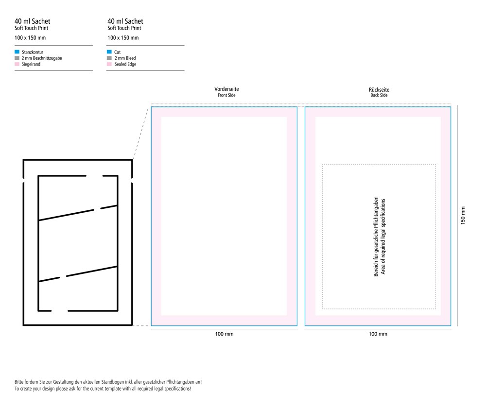 Druck auf das Sachet: 4c (CMYK) mit matter Soft-Touch-Oberfläche
